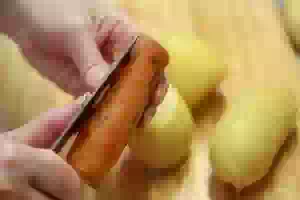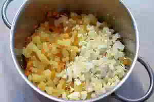 1. Подготовить овощи для салата. Морковь и картофель вымыть, сложить в кастрюлю с подсоленной кипящей водой и сварить до готовности. Слить с овощей воду, и когда они остынут, очистить. В отдельной кастрюле сварить яйца вкрутую (достаточно 10 минут после закипания). Сразу переложить в холодную воду, остудить и очистить.