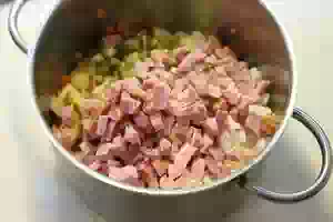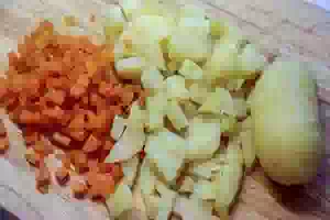 3. В салатник пересыпать нарезанные кубиками картофель с морковью. Тужа же добавить рубленые яйца,