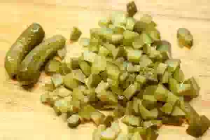 4. В маринованные или соленные огурцы, мелко нарезанный лук.