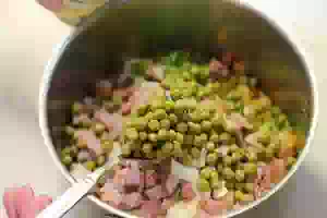 7. В горошка слить жидкость, пересыпать к остальным продуктам. Посолить, можно по вкусу поперчить и аккуратно перемешать.