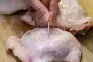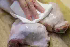 2. Зубочисткой часто наколоть кожу на бедрышках. Это делается для того, чтобы при запекании в духовке жир равномерно вытекал, и кожица получилась хрустящей.