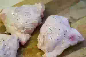 3. Натереть куриные бедра смесью соли и молотого черного перца. Противень застелить фольгой, на фольгу уложить лист пекарской бумаги и смазать его растительным маслом, используя для этого кулинарную кисточку. Уложить на противень куриные бедра и запекать в заранее разогретой до 200С духовке примерно 10 минут.