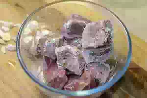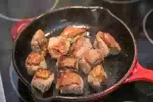 1. Говядину нарезать крупными кусочками или оставить одним целым куском. Приготовить панировку, смешав муку с солью и молотым черным перцем. Каждый кусочек мяса обвалять со всех сторон в муке.