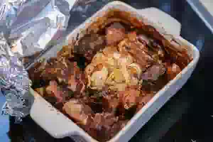 6. Накрыть мясо в форме фольгой, плотно прижать края. Поставить форму с говядиной в духовку, предварительно разогретую до 150С на 2.5 часа.