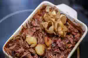 7. Готовую говядину прямо в форме разобрать вилкой на отдельные волокна и смешать с мякотью печеного чеснока и тем, что осталось от яблок. Получившуюся рваную говядину подавать как основное блюдо с гарниром по вкусу или просто с кусочком поджаренного хлеба. Рваная говядина в духовке готова.