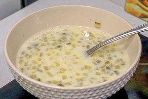 2. В миску разбить 2 яйца, налить молоко, насыпать щепотку соли и черного перца по вкусу. Все тщательно взбить и добавить измельченный огурец.