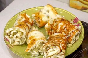 4. Спустя время омлет остудить и разрезать на полоски шириной приблизительно 3 см. Скатать разрезанный на полоски омлет рулетиками. То же самое проделать с оставшейся яичной смесью.