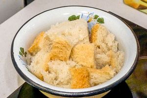 5. Теперь, когда омлет для зраз готов, нужно подготовить фарш. Луковицу измельчить. Раскрошить хлеб в миску и залить теплой водой на 10 минут.