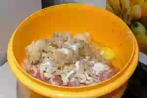 6. В мясной фарш положить лук, яйцо, хлеб, добавить перец и соль по вкусу. Хорошенько перемешать. Фарш для зраз готов.