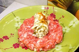 7. Из небольшого количества фарша сформировать лепешку. Положить в центр мясной лепешки рулетик. Защипывая края сформировать зразу. То же самое проделать с оставшимися ингредиентами.