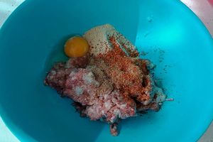 1. Заранее достать из холодильника сливочное масло, чтобы оно успело согреться и стать мягким. В миске смешать мясной фарш, сухари, яйцо, готовую смесь специй для котлет и измельчённый на терке или в блендере лук.