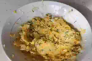 3. Для начинки сваренные вкрутую яйца и сыр измельчить на мелкой тёрке. Добавить мелко рубленую зелень, специи и сливочное масло. Сливочное масло должно быть мягким, комнатной температуры. Аккуратно перемешать, чтобы сыр и яйца равномерно распределились в получившейся кашице.