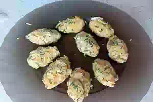 4. Слепить из начинки небольшие биточки, уложить на плоскую тарелку, застеленную пищевой пленкой, и убрать на 30 минут в морозильную камеру.