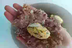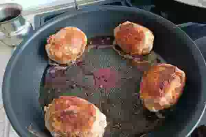 6. Другой рукой, приподнимая края лепешки, залепить начинку, чтобы она была надёжно спрятана в фарш и не вытекла при жарке на сковороде.
