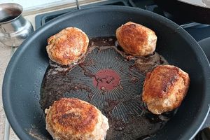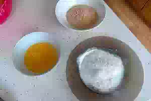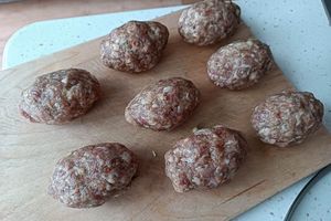 7. Каждую зразу сначала обвалять со всех сторон в муке, затем - во взбитом яйце и следом - в панировочных сухарях.