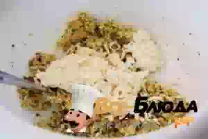 1. Смешиваем в тарелке пропущенный через пресс чеснок, панировочные сухари, базилик, орегано, петрушку и соль. Разбиваем яйца, хорошо перемешиваем, добавляем натертый сыр, перемешиваем до однородной массы.