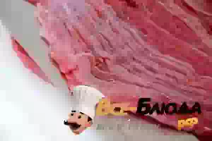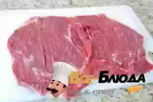 2. Говядину выкладываем на широкую доску и широким ножом аккуратно разрезаем кусок вдоль волокон. До конца не разрезаем, иначе получится два куска, а нужен один, толщиной примерно один сантиметр. Солим, перчим.