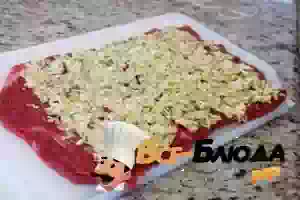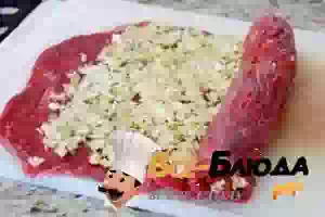 4. Сворачиваем говядину аккуратно в рулет , чтобы начинка не смещалась.