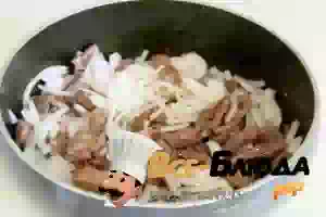 3. Добавьте мелко порезанный лук, соль и специи. Перемешайте и жарьте до мягкости лука.