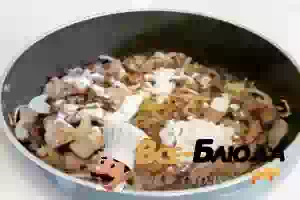 4. Через 10 минут добавляем муку, перемешиваем и продолжаем жарить.