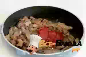 5. Добавляем томатную пасту, сахар и соль. Еще раз тщательно перемешиваем и жарим 3-4 минуты.