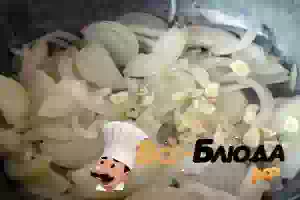2. На растительном масле обжарить лук репчатый с чесноком. До прозрачности лука.