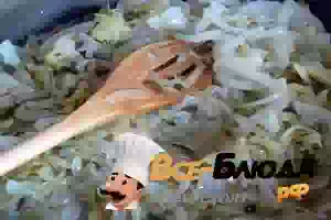 4. Разогреть в сковороде масло. Сначала обжарить лук репчатый до прозрачности, затем добавить огурцы вместе с рассолом, и тушить до выпаривания жидкости и готовности лука.