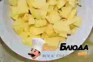 2. Очищенный картофель порезать мелкими кусочками. Выложить в кастрюлю кусочки картофеля, когда пшено полностью проварится. Довести до кипения, уменьшить огонь и варить около 30 минут.