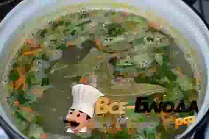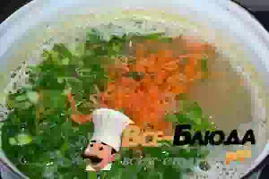 5. Натереть крупно очищенную морковь, измельчить зелень - лук и петрушку. Добавить в суп морковь и зелень.