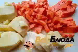 4. Картофель порезать кубиками. Чуть меньшими кубиками нарезать морковь. Сладкий перец порезать соломкой.