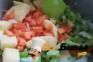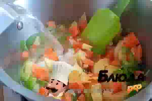 6. Затем залить овощи кипятком. Держать кастрюлю на небольшом огне до полной готовности продуктов, то есть пока они не станут абсолютно мягкими.