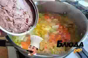7. После этого к ним пора отправлять консервированного тунца. С рыбы надо слить масло, размять вилкой и положить консервированные кусочки в кастрюлю.