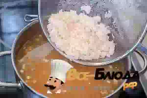 7. и промытый полуготовый рис. Так бульон после добавления риса останется прозрачным, не помутнеет, и вы сразу будете видеть, какой густоты у вас получился суп. Продолжать варить рыбный суп до готовности картофеля.