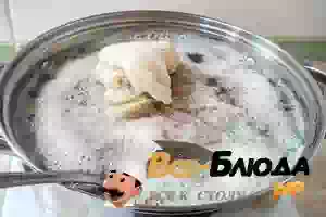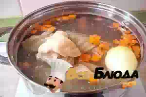 2. Поместить в кастрюлю узелок с рыбой и залить водой. Включить огонь. Перед закипанием снять пену. Юшку посолить.