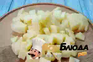 3. Морковь нарезать кубиком. Добавить к узелку с рыбой морковь и целую луковицу.