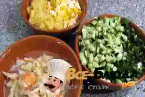 2. Сварила отвар на 1,25 литре подсолённой воды и протерла через сито. Попробовала и добавила по вкусу - сока лимона, у меня ушло примерно пол-лимона, сахара, примерно пол-ложки столовой и ещё немного подсолила. Отвар должен быть кисленький. Остудила и поставила в холодильник. Тем временем испекла в микроволновке картошку и яйца. Картошку лучше именно запечённую. Нарезала мелкими кубиками и картошку и яйца, огурцы и зелень. Припустила крабов до готовности, недолго (замороженные были). Бульон из-под крабов можно тоже остудить и добавить в отвар.