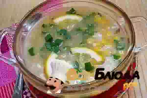 9. После закипания добавить крабовое мясо и вновь прокипятить суп. Подавать суп из краба, посыпав зеленым лучком и положив дольку лимона.