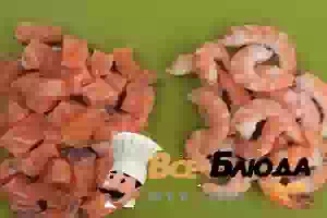 1. Креветки разморозить и почистить от панциря. Семгу помыть, зачистить от шкурки и порезать небольшими кубиками.