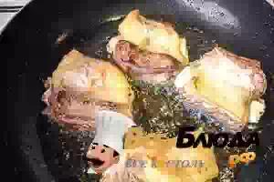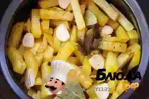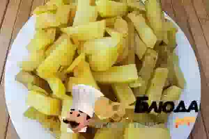 4. Картофель почистите и порежьте брусочками и обжарьте до золотистости.
