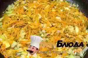 4. На раскаленной сковороде в масле обжариваем лук и морковь до румяности. Овощная поджарка для супа готова.