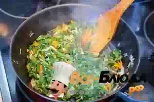8. Переложить в сковороду снять. Размешать и немного прогреть её. Обжаривать не надо. Овощную пассеровку со снытью переложить в кастрюлю с супом. Добавить лавровый лист, перец и соль по вкусу, размешать и дать супу повторно закипеть. Как только суп закипит, уменьшить огонь и варить 5 минут.