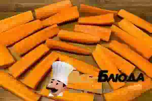 3. Пока мясо варится, подготовим овощи. Морковь делим на крупные брусочки.