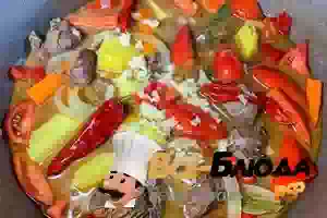 8. Отправляем в мясной бульон подготовленные: картофель, морковь, болгарский перец, полукольца лука. Варим 20 минут на среднем режиме.