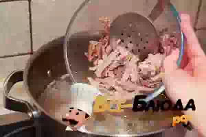 2. Вареное мясо выловить из кастрюли, отделить от костей и вернуть обратно.