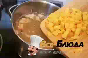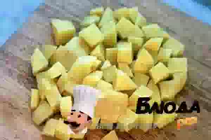 3. Пока варится мясо, картофель очистить, нарезать небольшими кубиками.