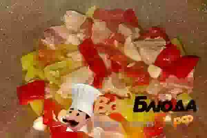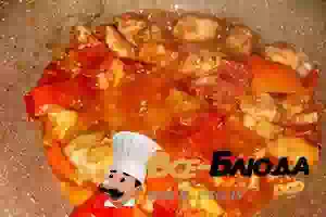 2. Мясо нарезать небольшими кусочками. У сладкого болгарского перца удалить семена с перегородками и нарезать, как вам больше нравится. Репчатый лук очистить, нарезать полукольцами. В казане разогреть растительное масло, добавить мясо и быстро обжарить до появления корочки. Следом переложить овощи и рубленый чеснок. Прикрыть мясо с овощами крышкой и оставить тушить на среднем огне около 20 минут.