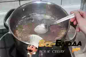 1. Сварить наваристый бульон на говяжьей грудинке. Для этого промыть под проточной холодной водой мясо на косточке, положить в кастрюлю, залить холодной водой. Как только вода начнет кипеть, уменьшить огонь до минимума, лавровый лист, несколько горошин черного перца и варить, снимая пену, 1.5 часа. При желании мясной бульон можно процедить.