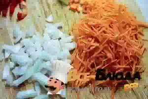 4. Лук мелко нарезать. Морковь очистить и порезать соломкой.