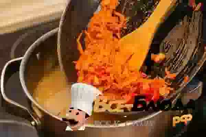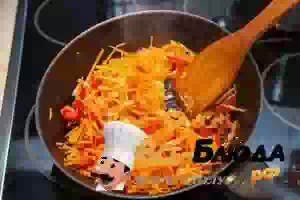 6. Для овощной пассеровки лук пассеровать до прозрачности на растительном масле. Следом добавить в сковороду морковь и сладкий перец. Обжаривать, помешивая, до мягкости овощей. Присыпать сладкой паприкой и размешать. Положить томатную пасту, можно влить ковшик бульона и томить овощи под крышкой на слабом огне.