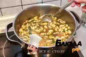 5. В готовый бульон переложить картошку, посолить по вкусу. Дать бульону закипеть, уменьшить огонь и варить 20 минут.